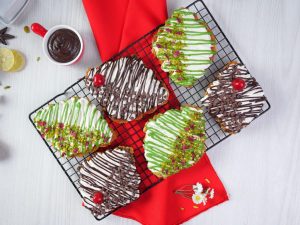 -In a grinder,add pistachios,cream,condensed milk,lemon juice,pink salt,green food color & grind well.Pistachio ganache is ready & transfer to a piping bag.