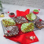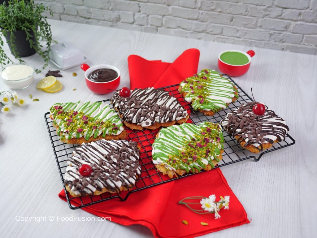 -Caramelized croissant par cream frosting spread karein,chocolate ganache lagayein,chocolate chips daalein aur cherry se garnish karein.