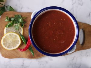 -In a chopper,add tomatoes,green chilli,garlic,fresh coriander,salt,black pepper powder,red chilli crushed,tomato paste & water,chop well & set aside.